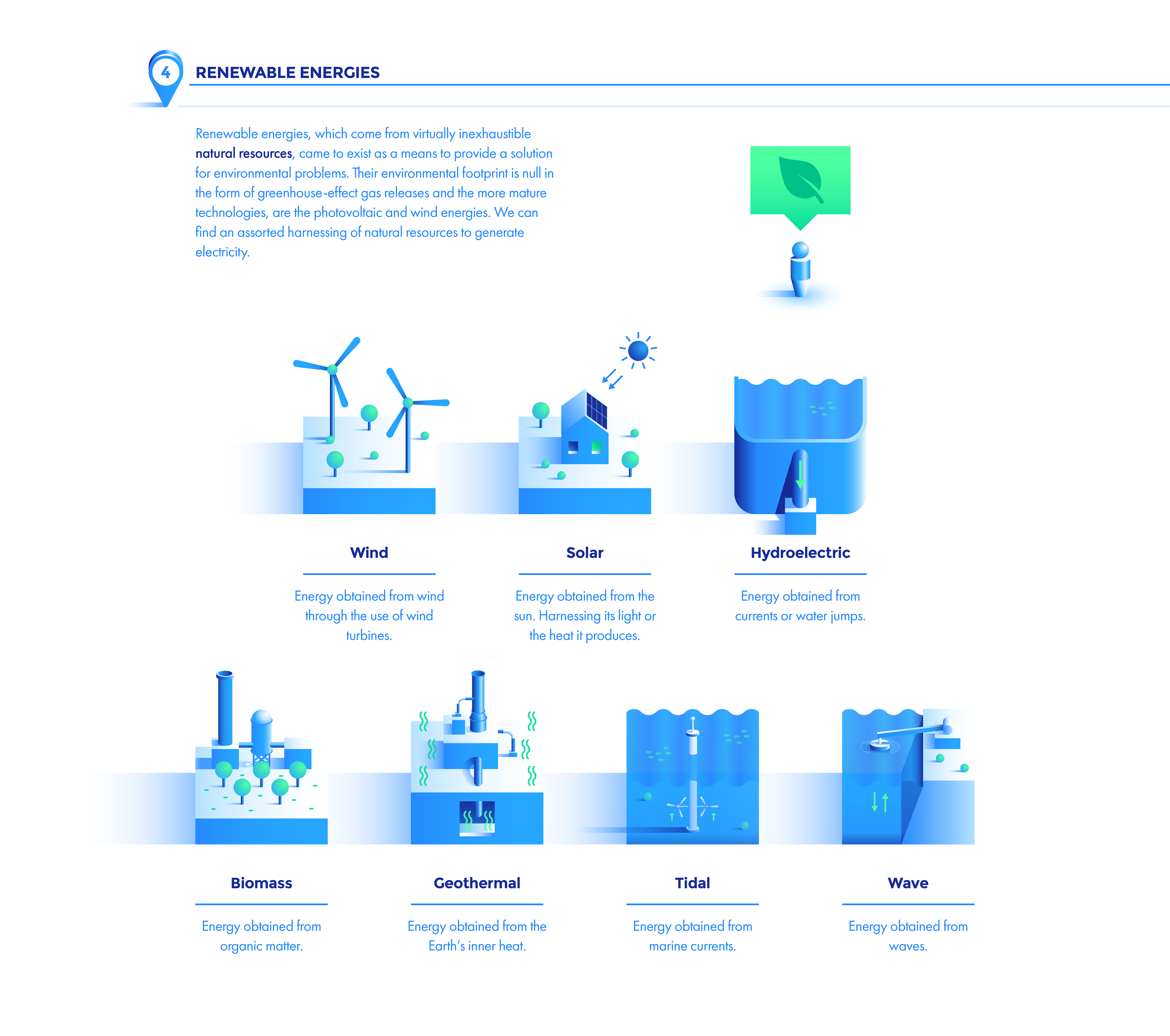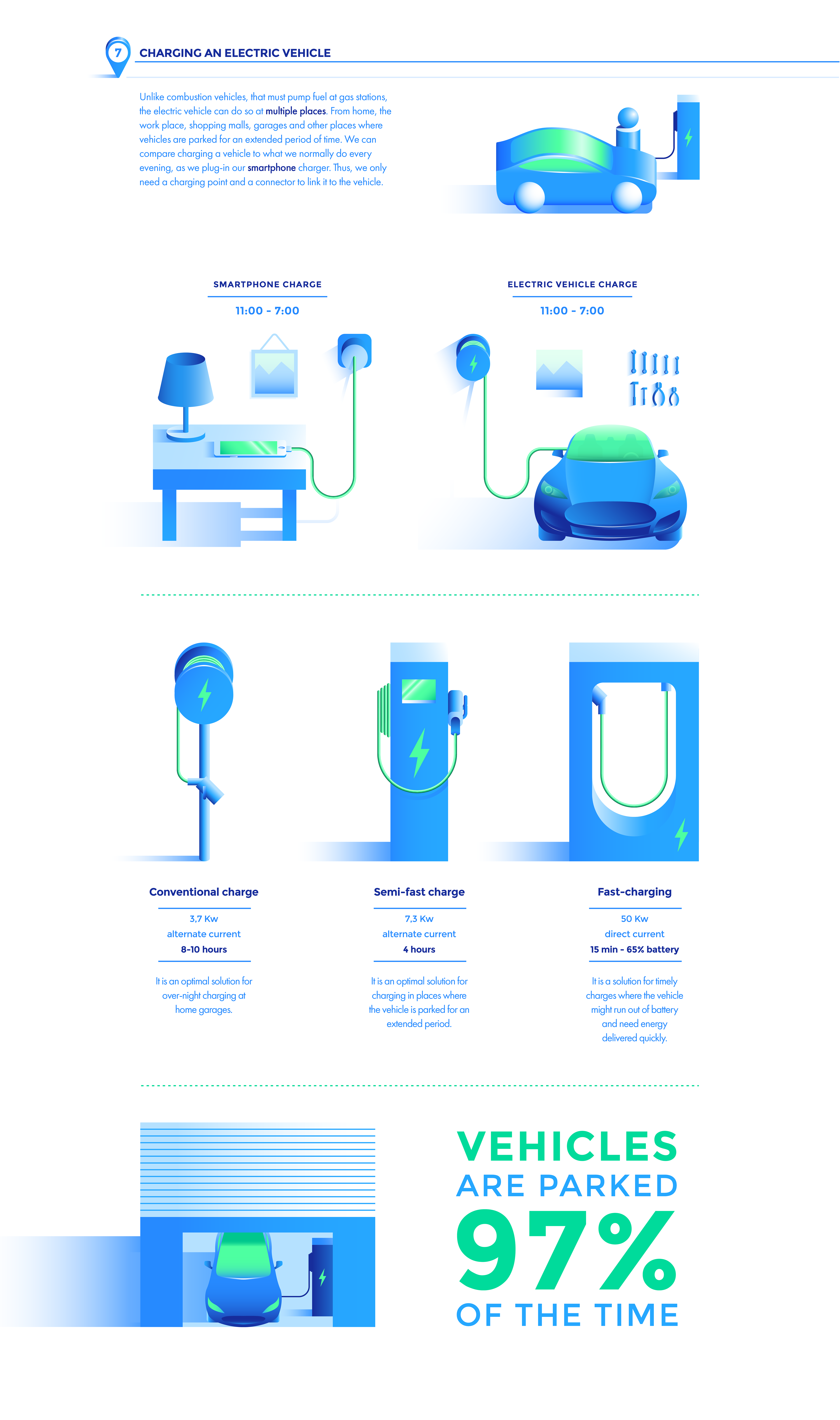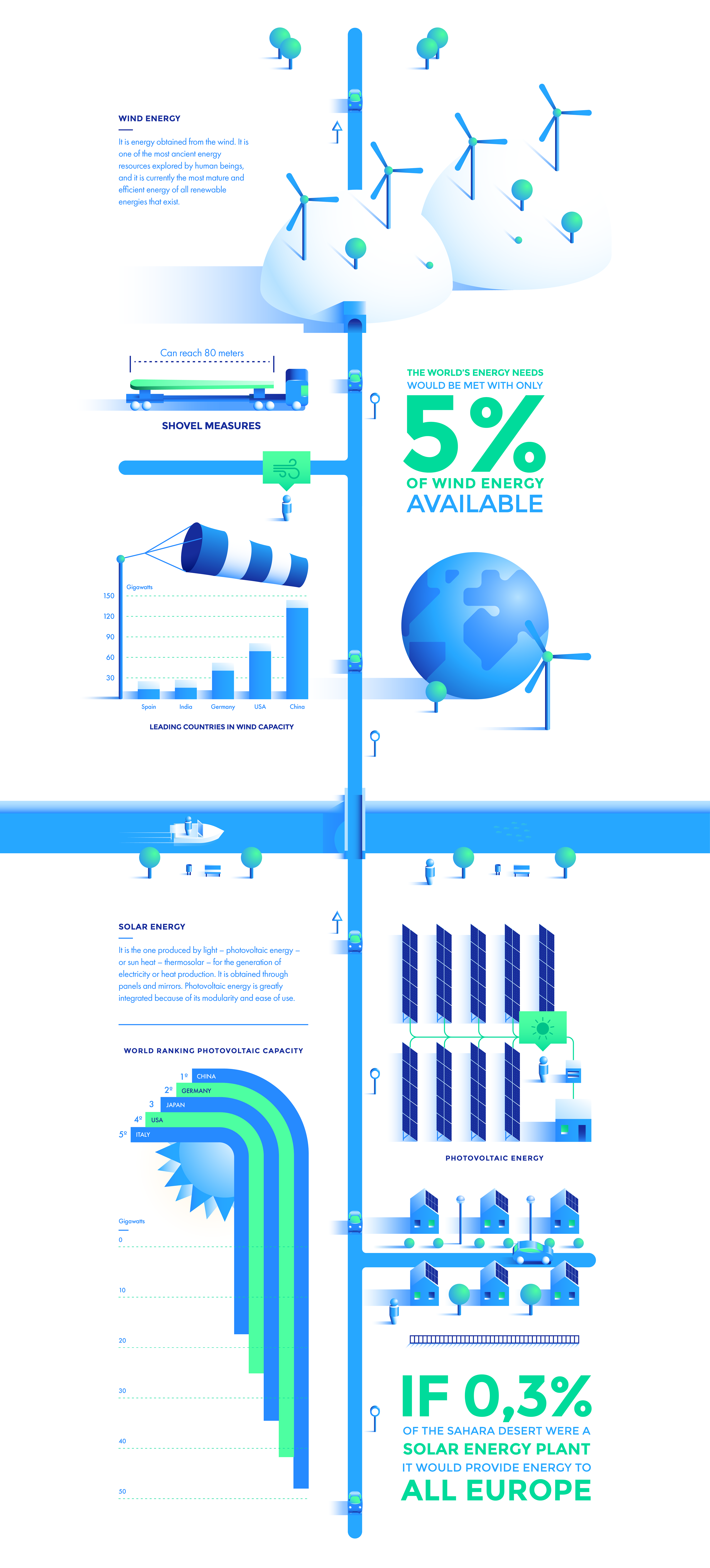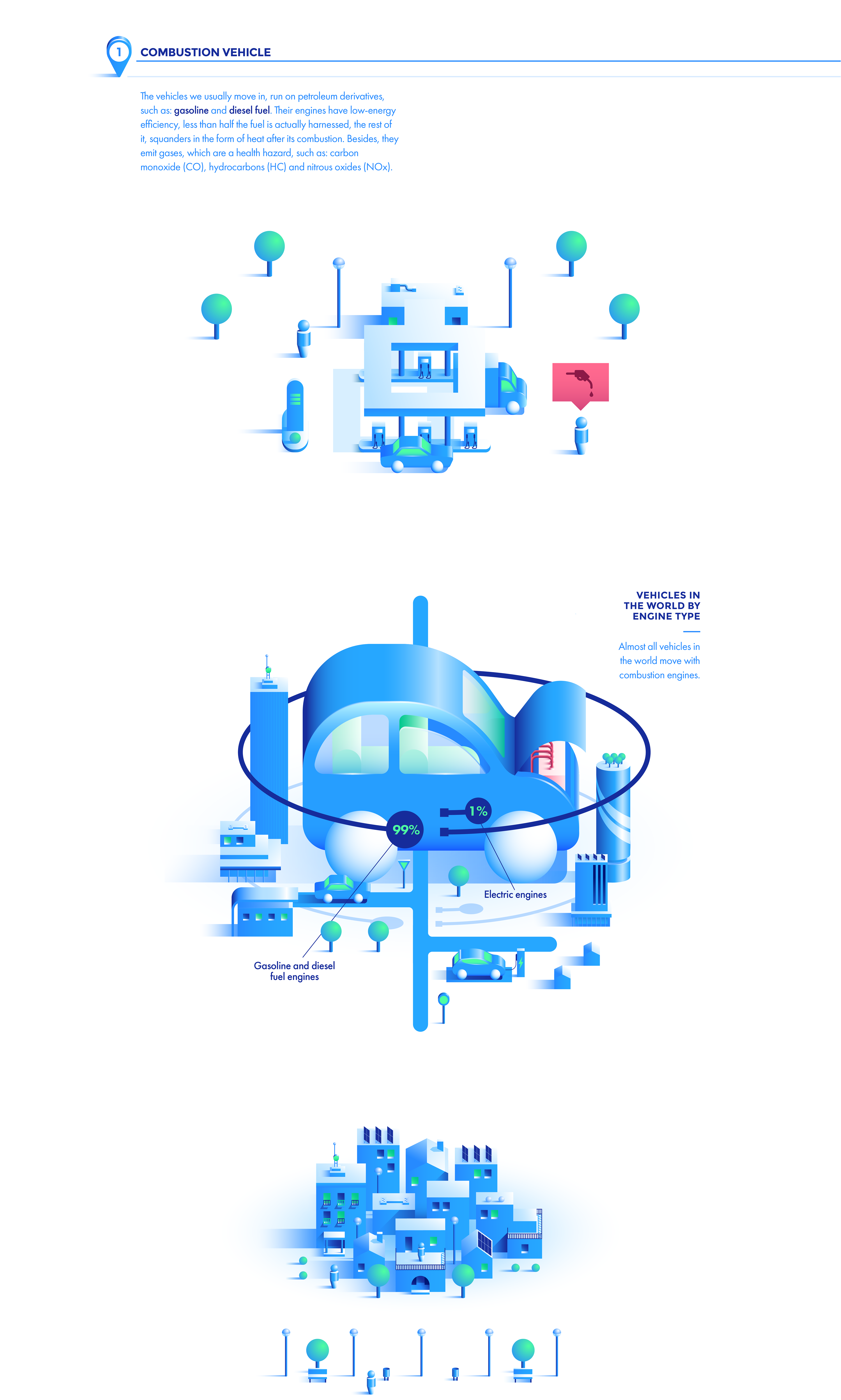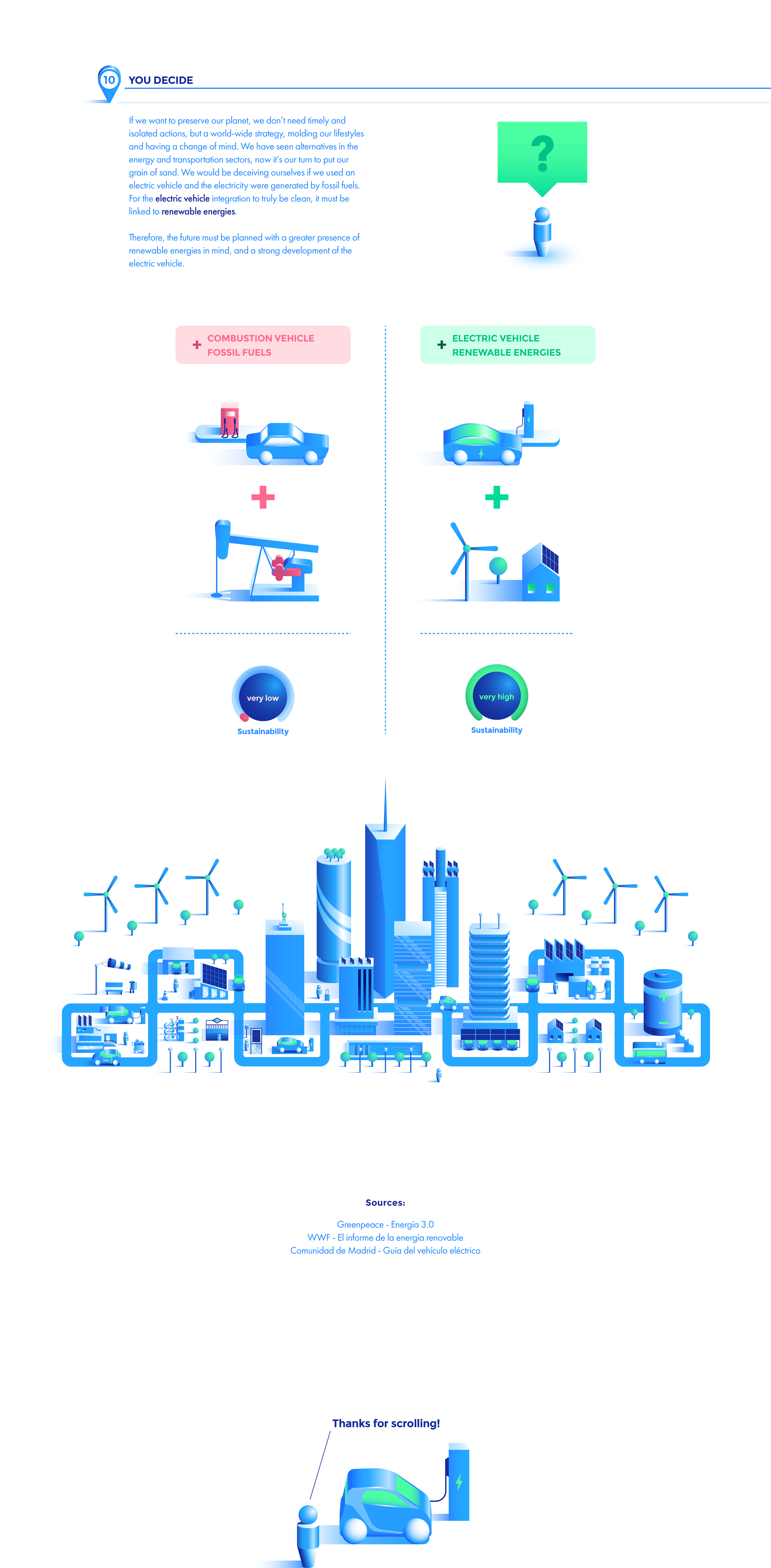 Ecomobility is a personal project about the electric vehicle and renewable energies. The aim is guide you through different alternatives and of sustainable development supported by a vector style with infographics and illustrations.